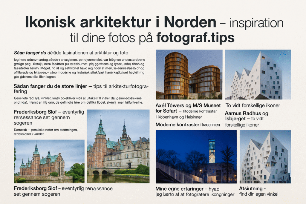 Her på fotograf.tips har vi talt om ikonisk nordisk arkitektur, men principperne gælder alle steder. Måske er der en spændende bygning i din egen by, du altid har taget for givet, prøv at fotografere den som var den et verdensberømt monument.
